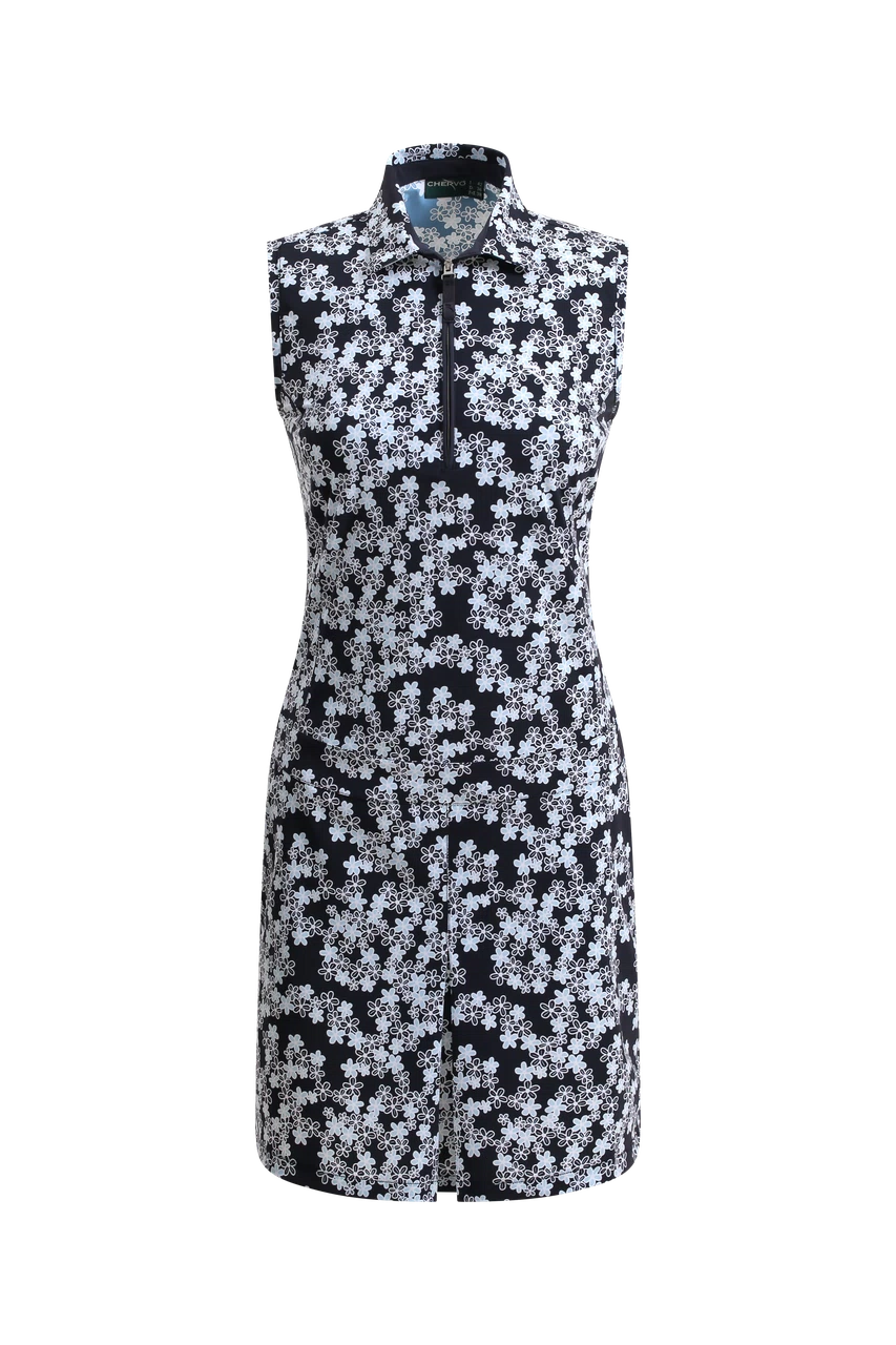 Abito senza maniche in tessuto Sunblock e Dry-Matic stampato in fantasia "Fancy box", bielastico, indemagliabile, indeformabile e riciclato. Il suo aspetto tecnico e la mano fresca lo rendono adatto per l'intera stagione. L'efficace trattamento anti UV protegge dai raggi solari più nocivi, oltre ad asciugare rapidamente. Apertura a mezza zip, collo con golina, due tasche comode e ampie. La piega centrale e la sfiancatura slanciano la figura, per un abito unico nel suo genere e super performante.