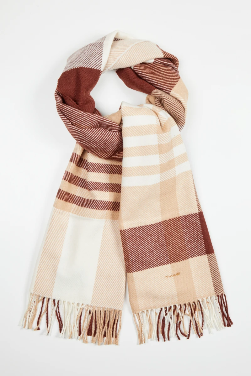 Sciarpa da donna in lana. Motivo a quadri tono su tono, rifinita con frange corte. Lana 100% di prima qualità, calda, leggera, traspirante e parzialmente idrorepellente. Questa sciarpa ti riscalderà anche nelle giornate più fredde. Un accessorio pratico e fantasioso che completerà con stile qualsiasi tuo outfit invernale.