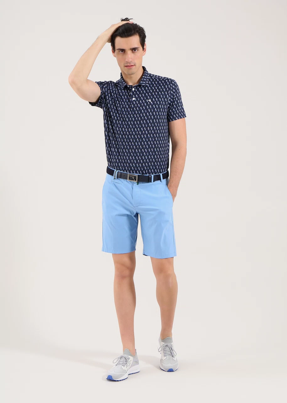 Bermuda uomo Plasmatic. Il trattamento innovativo ed ecologico realizzato sui filati conferiscono al tessuto in maniera permanente una rapida asciugatura ed evaporazione dell’umidità. Modello chinos con tasche posteriori doppio filetto e bottoni personalizzati. Chiusura con zip e doppio bottone personalizzato. Taschino frontale piccolo porta- tee. Lunghezza 25cm larghezza 25,5cm