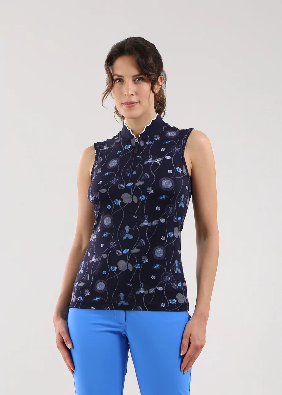 Polo donna mezza zip senza maniche in stampa all-over "Fancy box" su jersey stretch Dry-Matic e sunblock. Leggero e comfortevole, è ideale per la stagione inoltrata e asciuga rapidamente. Collo con cappetta stondata e bordo a contrasto, per un capo iconico e performante al tempo stesso.