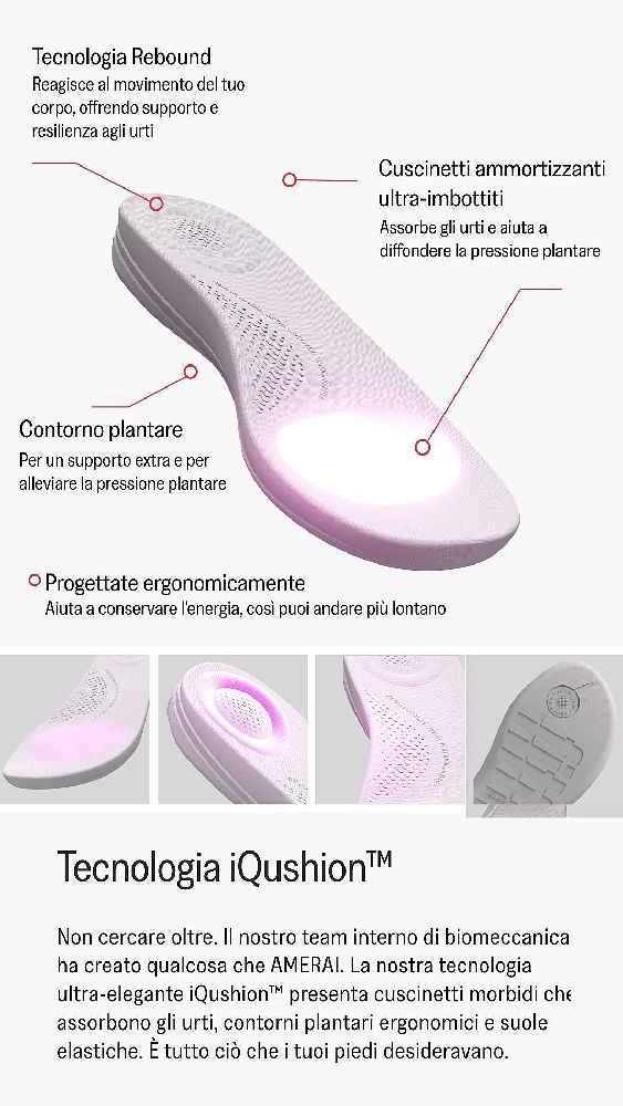 Sotto, la nostra elegante intersuola iQushion™: questa versione Super-Q in una nuova schiuma ad aria iniettata per flessibilità, leggerezza, ammortizzazione e rimbalzo estremi. Indossali e lascia che i tuoi piedi si muovano.